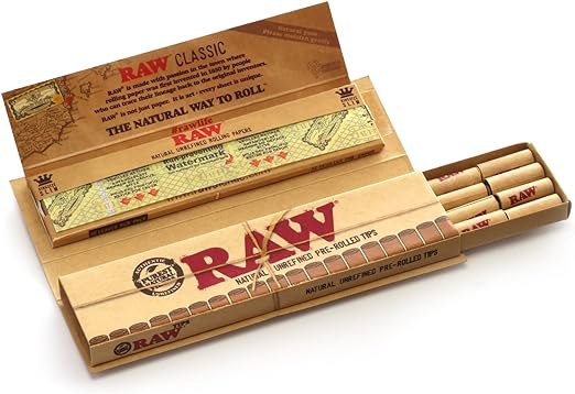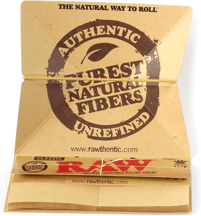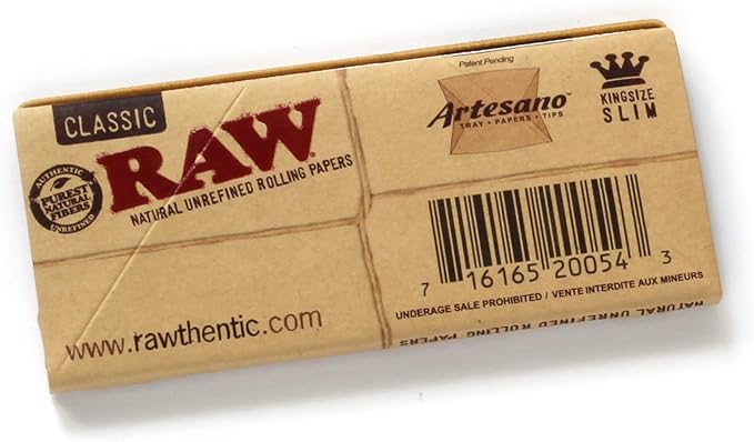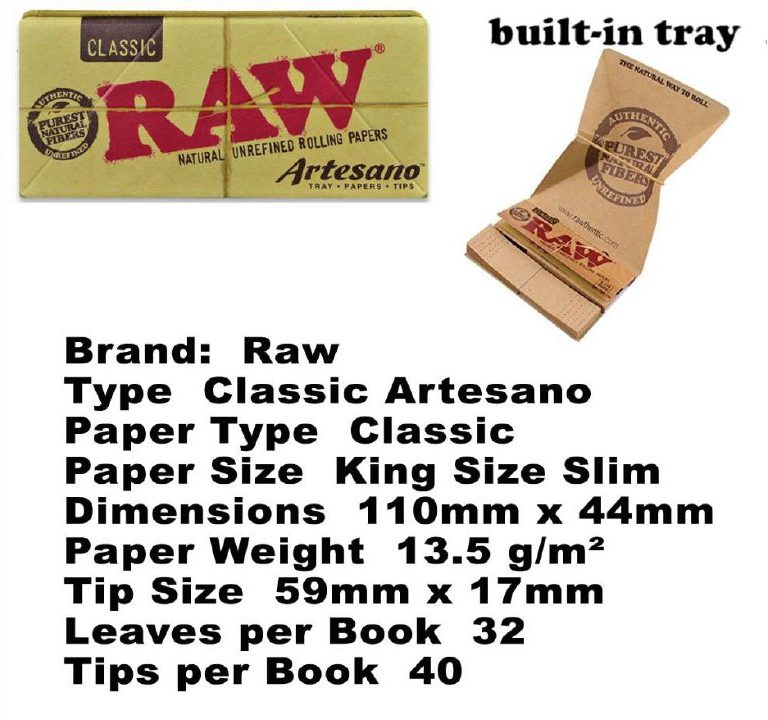 One RAW Artesano booklet contains fine natural King Size papers made from hemp, unbleached perforated tips and a pop-up spring-loaded rolling tray.